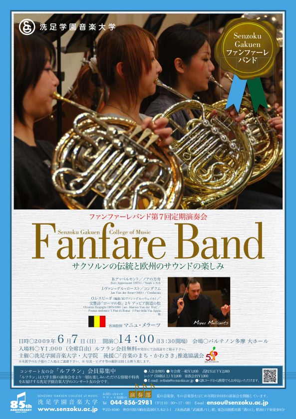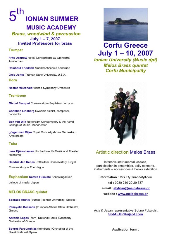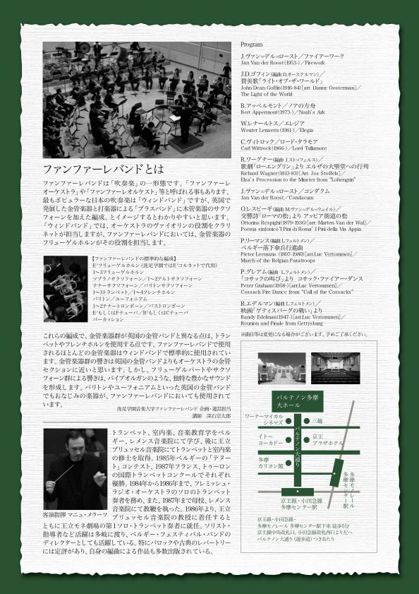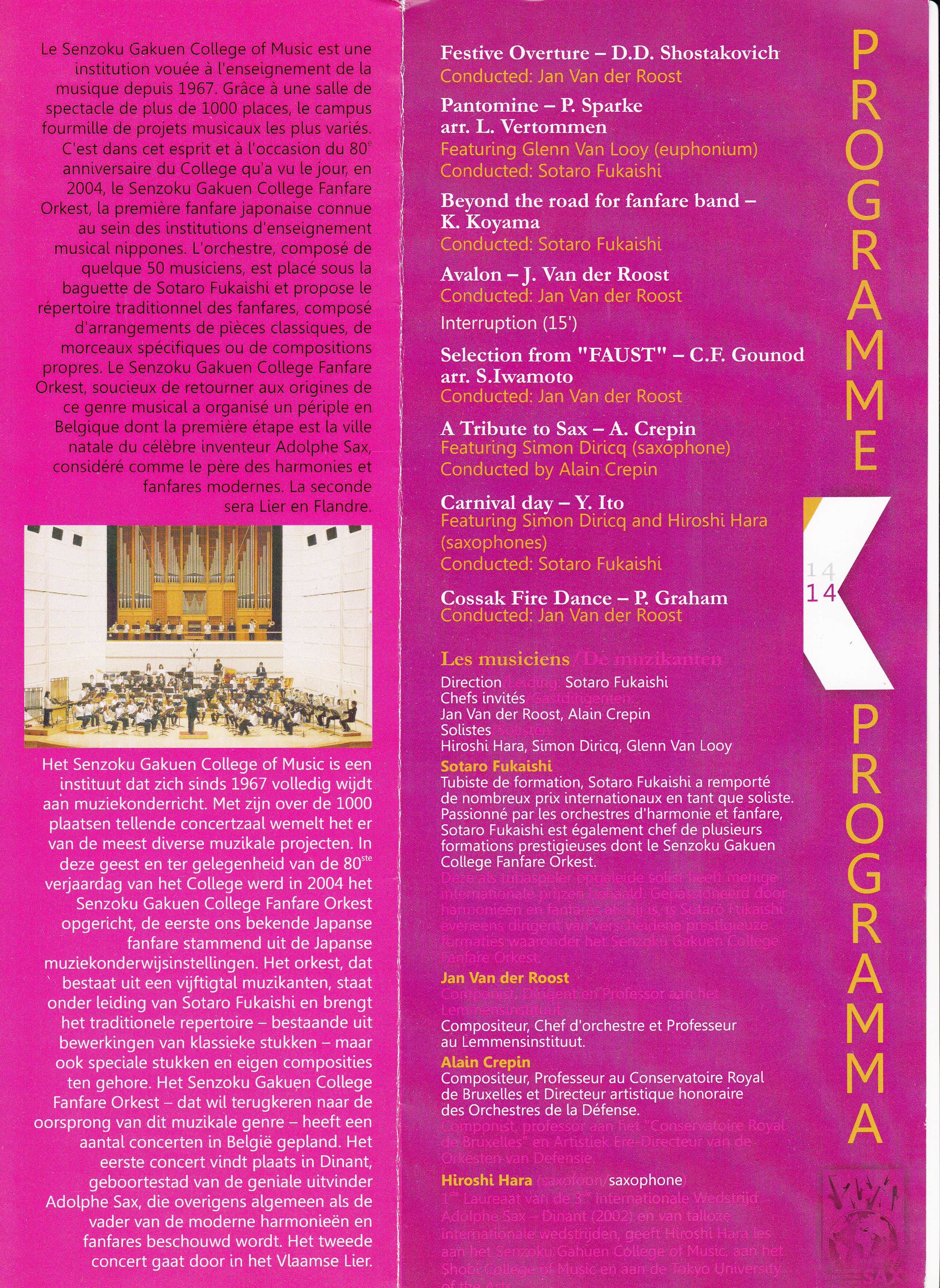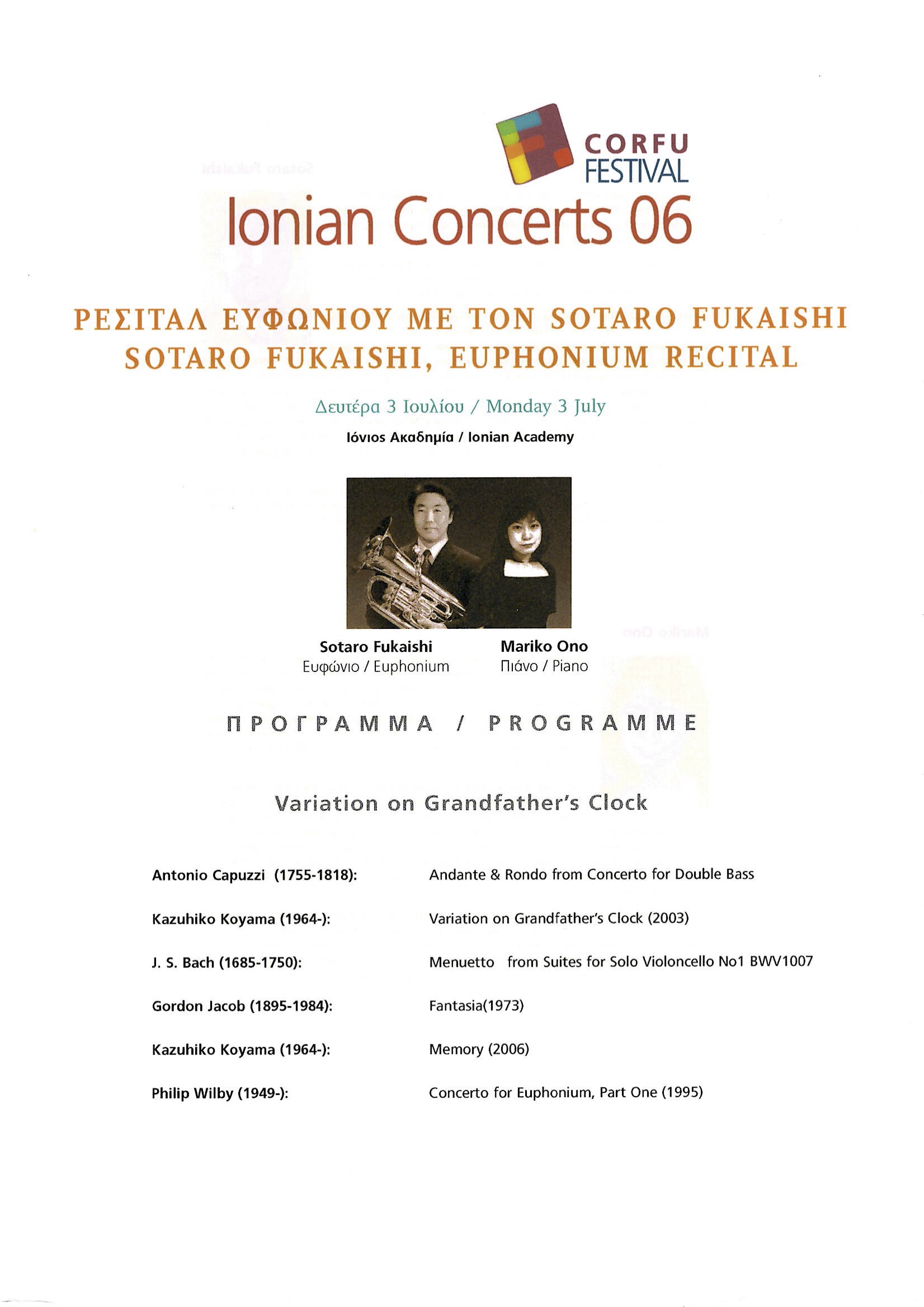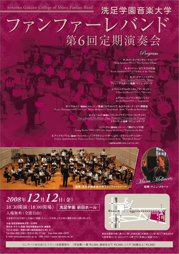 洗足学園ユーフォニアム合奏団静岡公演 2005年11月19日(土) 静岡県金谷町金谷生涯学習センターみんくる 14時30分会場 15時開演 曲目 トランペット吹きの休日 THREE MINIATURES op.29 日本歌曲メドレー モルダウ 他 主催 NPO法人『こころ』 洗足学園音楽大学ユーフォニアム合奏団 賛助 静岡福祉大学ウインドオーケストラサークル 洗足学園音楽大学 冬の音楽祭 2005年12月09日(金) 洗足学園前田ホール 18:30開演 指揮 J. バーンズ シンフォニック・ウィンド・オーケストラ プログラム 1. シンフォニック・オーバチュア/J. バーンズ 2. オマージオ/J. バーンズ 日本初演 3. トランペットとユーフォニアムのためのデュオ・コンチェルト/J. バーンズ トランペット:高橋 敦(東京都交響楽団首席) ユーフォニアム:深石宗太郎 リード博士に捧ぐ 4. 音楽祭のプレリュード/A. リード 5. 羊は静かに草を食む/J. S. バッハ(A. リード編曲) 6. ミステック神殿の貴族/スーザ 7. ローマの謝肉祭/ベルリオーズ 矢板ウインドオーケストラ第41回定期演奏会 2005年12月25日(日) 13:30開場 14:00開演 矢板市文化会館 入場料 1,00円(全席自由) 指揮 黒尾実(音楽監督) 演奏曲目 ・ブロックM(J・ビリク) ・夜明けの光に(D・ギリングハム) ・青い水平線(F・チェザリー二) ・デュオ・コンチェルタンテ(J・バーンズ) ・交響組曲「ロビンフッド」 ・ジャパニーズグラフィティ〜坂本九メモリアル〜 他 洗足学園大学ユーフォニアム合奏団 第7回演奏会 2006年2月24日(金) 18:30 開場 19:00 開演 <会場> みなとみらい小ホール(みなとみらい線「みなとみらい駅」より徒歩3分) <入場料> 1,000円 800円(J.E.T.A.会員) <曲目> P.スパーク/パントマイム、ほか <ホームページ> http://www.geocities.jp/senzokueuph/index.html テュービアム・コンサート Vol.5 2006年4月18日(火) 19:00 開演 <会場> 横浜みなとみらいホール(小ホール) <曲目> 石毛 里佳 / 奇妙なワルツ、ほか <出演> 音楽監督:戸田 顕 ユーフォニアム:庄司 恵子・深石 宗太郎・山戸 宏之 テューバ:堤 拓幸・山岸 明彦 <ホームページ> http://www002.upp.so-net.ne.jp/TUBIUM/ 第9回彩たま低音's倶楽部 定期演奏会 with TUBIUM 2006年5月13日(土) 14:00 開演 <会場> 練馬文化センター小ホール(西武池袋線・都営地下鉄大江戸線「練馬駅」下車徒歩1分) <入場料> 無料 <ゲスト> TUBIUM <ホームページ> http://www.teions.org/ 洗足学園音楽大学ファンファーレバンド・コンサート 2006年6月4日(日) 13:30 開場 14:00 開演 <会場> 洗足学園前田ホール(田園都市線「溝の口」駅、南武線「武蔵溝ノ口」駅下車 徒歩8分) <指揮> ヤン・ヴァン=デル=ロースト <曲目> トロンボーン独奏 府川雪野/アッペルモント/カラーズ、ほか 深石宗太郎 ユーフォニアムリサイタル 2006年7月3日 ギリシャ・コルフ島ケルキラ 洗足学園音楽大学 ファンファーレバンド定期演奏会 2006年11月16日(木) 18:30 開演 <会場> 洗足学園 前田ホール(溝の口、武蔵溝ノ口 徒歩8分) <入場料> 無料(全席自由) <曲目> G.ヘンデル/組曲「王宮の花火の音楽」、ほか <ホームページ> http://www.senzoku.ac.jp/ 洗足学園音楽大学ユーフォニアム合奏団 第8回演奏会 2007年1月11日(木) 19:00 開演 <会場> 横浜みなとみらい小ホール(みなとみらい線「みなとみらい」駅より徒歩3分) <ホームページ> http://www.geocities.jp/senzokueuph/top.html リーズ大学 コンサート 2007年3月4日(日) 14:30 開演 <会場> 英国 リーズ大学 <曲目> ウィルビー/ユーフォニアム協奏曲、ほか <ホームページ> http://www.leeds.ac.uk/music/concerts.htm (Event 32) 5th IONIAN SUMMER MUSIC ACADEMY 2007年7月1日(日) - 10日(火) <会場> Ionian University (Music dpt) <ホームページ> http://www.melosbrass.gr/HTMLENG/academy5thENG.htm 第三回寺田由美マリンバ&パーカッションリサイタル 2007年11月14日(水) 19:00 開演 <会場> 横浜みなとみらいホール 小ホール <曲目> ガリアルド / 6つのソナタよりV、ほか <出演> 寺田由美(Marimba & Percussion) 深石宗太郎(Euph.) 寺田由美パーカッション・アンサンブル「ドライブ」 (寺田由美・東佳樹・土屋吉弘・内田真裕子・秋田孝訓) <ホームページ> http://www.terada-yumi.net/ 洗足学園音楽大学ファンファーレバンド第4回定期演奏会 〜音楽表現への挑戦〜 2007年11月16日(金) 18:30 開演 <会場> 洗足学園 前田ホール <指揮> 増井信貴(本学客員教授)、大木孝雄(本学講師) <ユーフォニアム独奏> 栗津芳紀 <演奏> 洗足学園音楽大学ファンファーレバンド <踊り> 洗足学園音楽大学ミュージカルコース生 <曲目> David Gillingham/Vintage for Euphnium and Symphonic Band、ほか <ホームページ> http://www.senzoku.ac.jp/ 東海大学付属相模高等学校特別公開講座 メロス金管5重奏団特別公開講座&記念コンサート 2007年12月9日(日) 14:00 開演 <会場> 東海大学付属相模高等学校3号館5F 大ホール <ホームページ> http://www.sagami.tokai.ed.jp/ 洗足学園音楽大学ファンファーレバンド 第5回定期演奏会 2008年6月13日(金)18:30開演 洗足学園前田ホール (「溝の口」「武蔵溝ノ口」徒歩8分) 指揮:ヤン・ヴァン=デル=ロースト 客員教授 曲目:VOICES OF YOUTH (E. Gregson) INDIAN SUMMER (E. Ball) THE INNOCENT CONDEMNED (R. Goorhuis) AMAZONIA (J. Van der Roost) GAILLARDE (P. Attaignant / M. Mellaerts) SYMPHO
