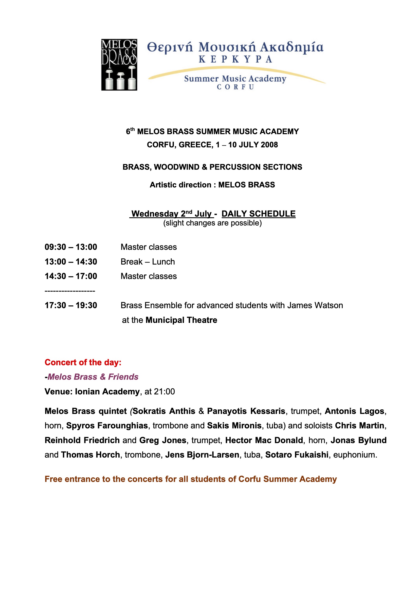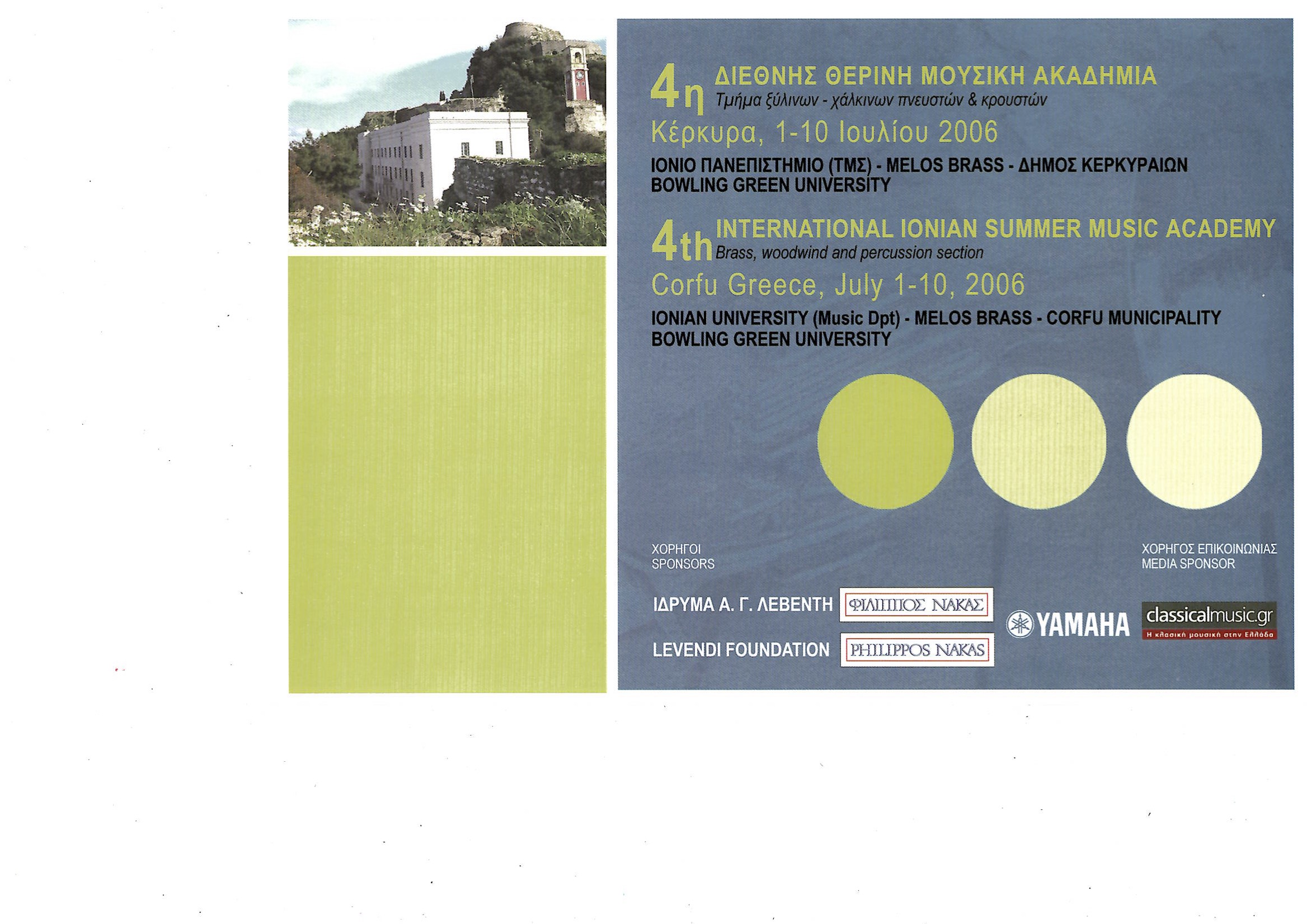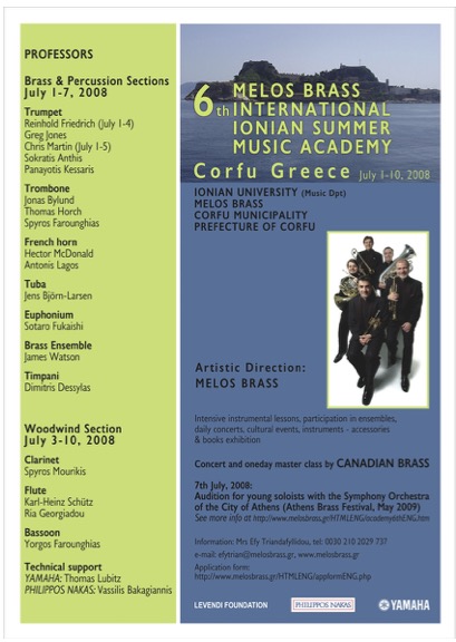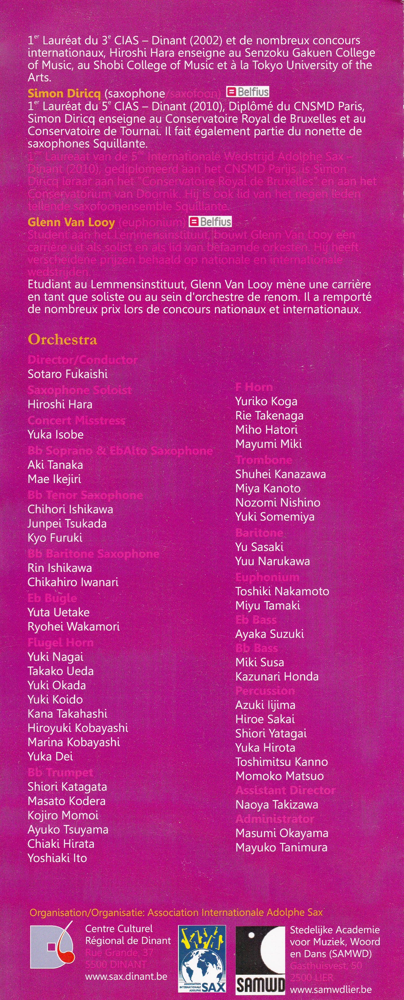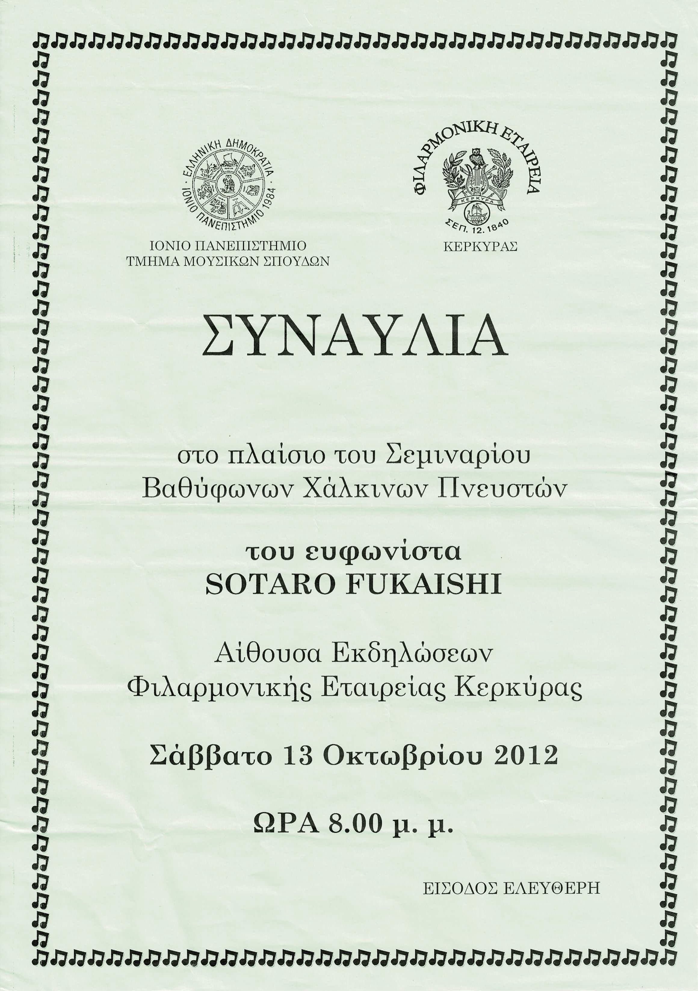 洗足学園ユーフォニアム合奏団静岡公演 2005年11月19日(土) 静岡県金谷町金谷生涯学習センターみんくる 14時30分会場 15時開演 曲目 トランペット吹きの休日 THREE MINIATURES op.29 日本歌曲メドレー モルダウ 他 主催 NPO法人『こころ』 洗足学園音楽大学ユーフォニアム合奏団 賛助 静岡福祉大学ウインドオーケストラサークル 洗足学園音楽大学 冬の音楽祭 2005年12月09日(金) 洗足学園前田ホール 18:30開演 指揮 J. バーンズ シンフォニック・ウィンド・オーケストラ プログラム 1. シンフォニック・オーバチュア/J. バーンズ 2. オマージオ/J. バーンズ 日本初演 3. トランペットとユーフォニアムのためのデュオ・コンチェルト/J. バーンズ トランペット:高橋 敦(東京都交響楽団首席) ユーフォニアム:深石宗太郎 リード博士に捧ぐ 4. 音楽祭のプレリュード/A. リード 5. 羊は静かに草を食む/J. S. バッハ(A. リード編曲) 6. ミステック神殿の貴族/スーザ 7. ローマの謝肉祭/ベルリオーズ 矢板ウインドオーケストラ第41回定期演奏会 2005年12月25日(日) 13:30開場 14:00開演 矢板市文化会館 入場料 1,00円(全席自由) 指揮 黒尾実(音楽監督) 演奏曲目 ・ブロックM(J・ビリク) ・夜明けの光に(D・ギリングハム) ・青い水平線(F・チェザリー二) ・デュオ・コンチェルタンテ(J・バーンズ) ・交響組曲「ロビンフッド」 ・ジャパニーズグラフィティ〜坂本九メモリアル〜 他 洗足学園大学ユーフォニアム合奏団 第7回演奏会 2006年2月24日(金) 18:30 開場 19:00 開演 <会場> みなとみらい小ホール(みなとみらい線「みなとみらい駅」より徒歩3分) <入場料> 1,000円 800円(J.E.T.A.会員) <曲目> P.スパーク/パントマイム、ほか <ホームページ> http://www.geocities.jp/senzokueuph/index.html テュービアム・コンサート Vol.5 2006年4月18日(火) 19:00 開演 <会場> 横浜みなとみらいホール(小ホール) <曲目> 石毛 里佳 / 奇妙なワルツ、ほか <出演> 音楽監督:戸田 顕 ユーフォニアム:庄司 恵子・深石 宗太郎・山戸 宏之 テューバ:堤 拓幸・山岸 明彦 <ホームページ> http://www002.upp.so-net.ne.jp/TUBIUM/ 第9回彩たま低音's倶楽部 定期演奏会 with TUBIUM 2006年5月13日(土) 14:00 開演 <会場> 練馬文化センター小ホール(西武池袋線・都営地下鉄大江戸線「練馬駅」下車徒歩1分) <入場料> 無料 <ゲスト> TUBIUM <ホームページ> http://www.teions.org/ 洗足学園音楽大学ファンファーレバンド・コンサート 2006年6月4日(日) 13:30 開場 14:00 開演 <会場> 洗足学園前田ホール(田園都市線「溝の口」駅、南武線「武蔵溝ノ口」駅下車 徒歩8分) <指揮> ヤン・ヴァン=デル=ロースト <曲目> トロンボーン独奏 府川雪野/アッペルモント/カラーズ、ほか 深石宗太郎 ユーフォニアムリサイタル 2006年7月3日 ギリシャ・コルフ島ケルキラ 洗足学園音楽大学 ファンファーレバンド定期演奏会 2006年11月16日(木) 18:30 開演 <会場> 洗足学園 前田ホール(溝の口、武蔵溝ノ口 徒歩8分) <入場料> 無料(全席自由) <曲目> G.ヘンデル/組曲「王宮の花火の音楽」、ほか <ホームページ> http://www.senzoku.ac.jp/ 洗足学園音楽大学ユーフォニアム合奏団 第8回演奏会 2007年1月11日(木) 19:00 開演 <会場> 横浜みなとみらい小ホール(みなとみらい線「みなとみらい」駅より徒歩3分) <ホームページ> http://www.geocities.jp/senzokueuph/top.html リーズ大学 コンサート 2007年3月4日(日) 14:30 開演 <会場> 英国 リーズ大学 <曲目> ウィルビー/ユーフォニアム協奏曲、ほか <ホームページ> http://www.leeds.ac.uk/music/concerts.htm (Event 32) 5th IONIAN SUMMER MUSIC ACADEMY 2007年7月1日(日) - 10日(火) <会場> Ionian University (Music dpt) <ホームページ> http://www.melosbrass.gr/HTMLENG/academy5thENG.htm 第三回寺田由美マリンバ&パーカッションリサイタル 2007年11月14日(水) 19:00 開演 <会場> 横浜みなとみらいホール 小ホール <曲目> ガリアルド / 6つのソナタよりV、ほか <出演> 寺田由美(Marimba & Percussion) 深石宗太郎(Euph.) 寺田由美パーカッション・アンサンブル「ドライブ」 (寺田由美・東佳樹・土屋吉弘・内田真裕子・秋田孝訓) <ホームページ> http://www.terada-yumi.net/ 洗足学園音楽大学ファンファーレバンド第4回定期演奏会 〜音楽表現への挑戦〜 2007年11月16日(金) 18:30 開演 <会場> 洗足学園 前田ホール <指揮> 増井信貴(本学客員教授)、大木孝雄(本学講師) <ユーフォニアム独奏> 栗津芳紀 <演奏> 洗足学園音楽大学ファンファーレバンド <踊り> 洗足学園音楽大学ミュージカルコース生 <曲目> David Gillingham/Vintage for Euphnium and Symphonic Band、ほか <ホームページ> http://www.senzoku.ac.jp/ 東海大学付属相模高等学校特別公開講座 メロス金管5重奏団特別公開講座&記念コンサート 2007年12月9日(日) 14:00 開演 <会場> 東海大学付属相模高等学校3号館5F 大ホール <ホームページ> http://www.sagami.tokai.ed.jp/ 洗足学園音楽大学ファンファーレバンド 第5回定期演奏会 2008年6月13日(金)18:30開演 洗足学園前田ホール (「溝の口」「武蔵溝ノ口」徒歩8分) 指揮:ヤン・ヴァン=デル=ロースト 客員教授 曲目:VOICES OF YOUTH (E. Gregson) INDIAN SUMMER (E. Ball) THE INNOCENT CONDEMNED (R. Goorhuis) AMAZONIA (J. Van der Roost) GAILLARDE (P. Attaignant / M. Mellaerts) SYMPHO