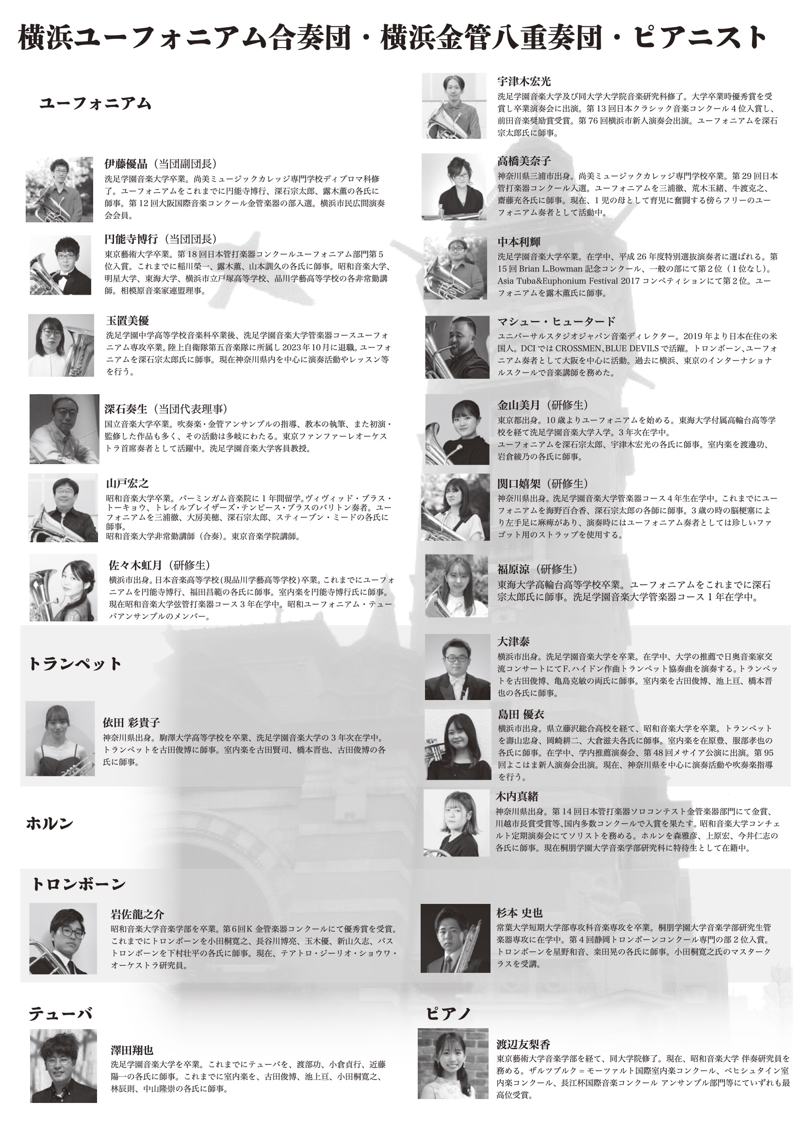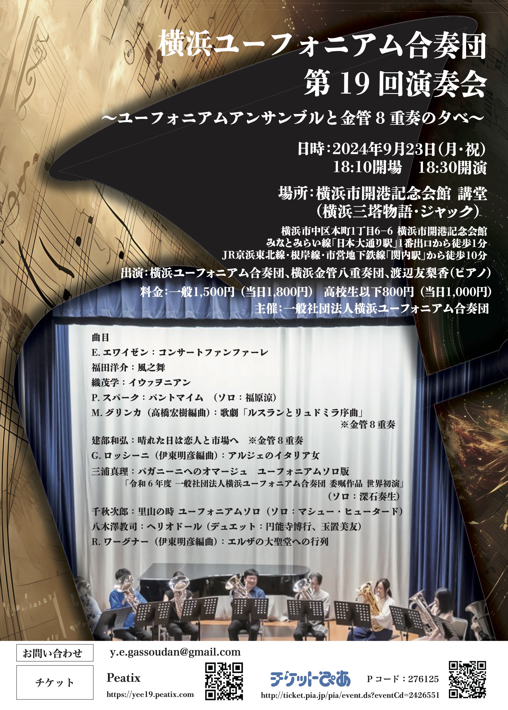 横浜ユーフォニアム合奏団第19回演奏会 〜ユーフォニアムアンサンブルと金管8重奏の夕べ〜 出演:横浜ユーフォニアム合奏団、横浜金管八重奏団、渡辺友梨香(ピアノ) 主催:一般社団法人横浜ユーフォニアム合奏団 日時:2024年9月23日(月・祝)18:10開場 18:30開演 場所:横浜市開港記念会館 講堂 (横浜三塔物語・ジャック) 横浜市中区本町1丁目6−6 横浜市開港記念会館 みなとみらい線「日本大通り駅」1番出口から徒歩1分、JR京浜東北線・根岸線・市営地下鉄線「関内駅」から徒歩10分 料金:一般1500円 (当日1800円) 、高校生以下800円 (当日1000円) https://yee19.peatix.com チケットぴあ Pコード:276125 (URL:http://ticket.pia.jp/pia/event.ds?eventCd=2426551) 曲目 E.エワイゼン:コンサートファンファーレ 福田洋介:風之舞 織茂学:イウフヲニアン P.スパーク:パントマイム (ソロ:福原涼) M.グリンカ(高橋宏樹編曲):歌劇「ルスランとリュドミラ序曲(金管8重奏)」 建部和弘:晴れた日は恋人と市場へ(金管8重奏) G.ロッシーニ(伊東明彦編曲):アルジェのイタリア女 三浦真理:パガニーニへのオマージュ ユーフォニアムソロ版 「令和6年度 一般社団法人横浜ユーフォニアム合奏団 委嘱作品 世界初演」(ソロ:深石奏生) 千秋次郎:里山の時 ユーフォニアムソロ(ソロ:マシュー・ヒュータード) 八木澤教司:ヘリオドール(デュエット:円能寺博行、玉置美友) R.ワーグナー(伊東明彦編曲):エルザの大聖堂への行列 PR SOTARO FUKAISHI 過去の演奏記録